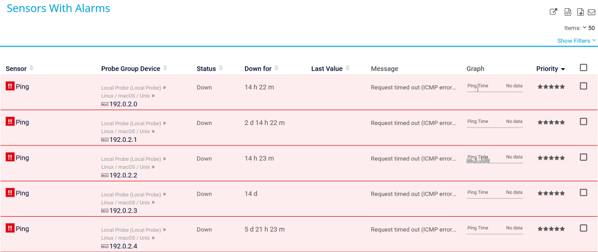 You can see all sensors that are in the Down, Down (Partial), Down (Acknowledged), Warning, or the Unusual status. Sensors in other states, for example, Up, Paused, or Unknown, do not appear here. This is useful for keeping track of all irregularities in your network.
