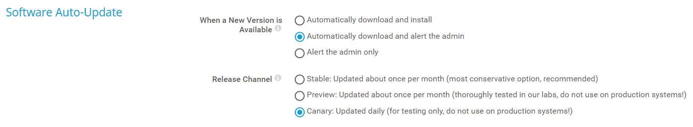 Canary: Updated daily (testing only, should not be used on production systems): Deliver updates in the Canary release channel. These versions are updated every night. Use with caution. Software versions in this channel have not been tested, might contain severe bugs, and are provided for testing purposes only. We strongly recommend that you not use these software versions in live environments that you depend on.