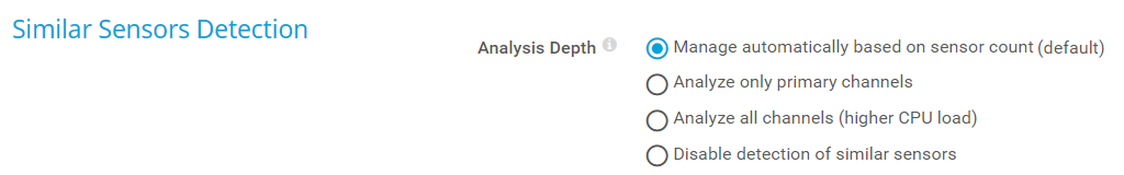 Disable detection of similar sensors: Do not detect similarities. Select this option if you are not interested in the analysis results or if you want to keep the CPU load on the PRTG core server system to a minimum. This is the default setting in PRTG Hosted Monitor.