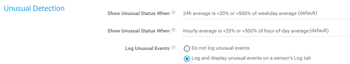 You can define the granularity of the unusual detection, that is, how big the difference must be to cause the Unusual status. If you disable the unusual detection by setting both settings to Never, sensors never show the Unusual status.