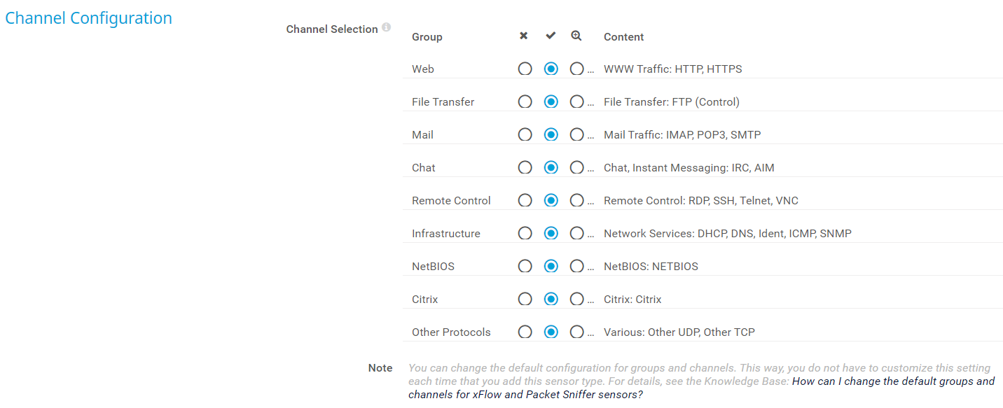 No (): Do not account traffic of this group in its own channel. The sensor accounts all traffic of this group to the default channel named Other.