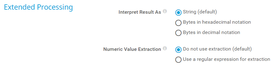 Bytes in hexadecimal notation: Handle the result as bytes in hexadecimal notation. For example, select this option if you monitor MAC addresses.