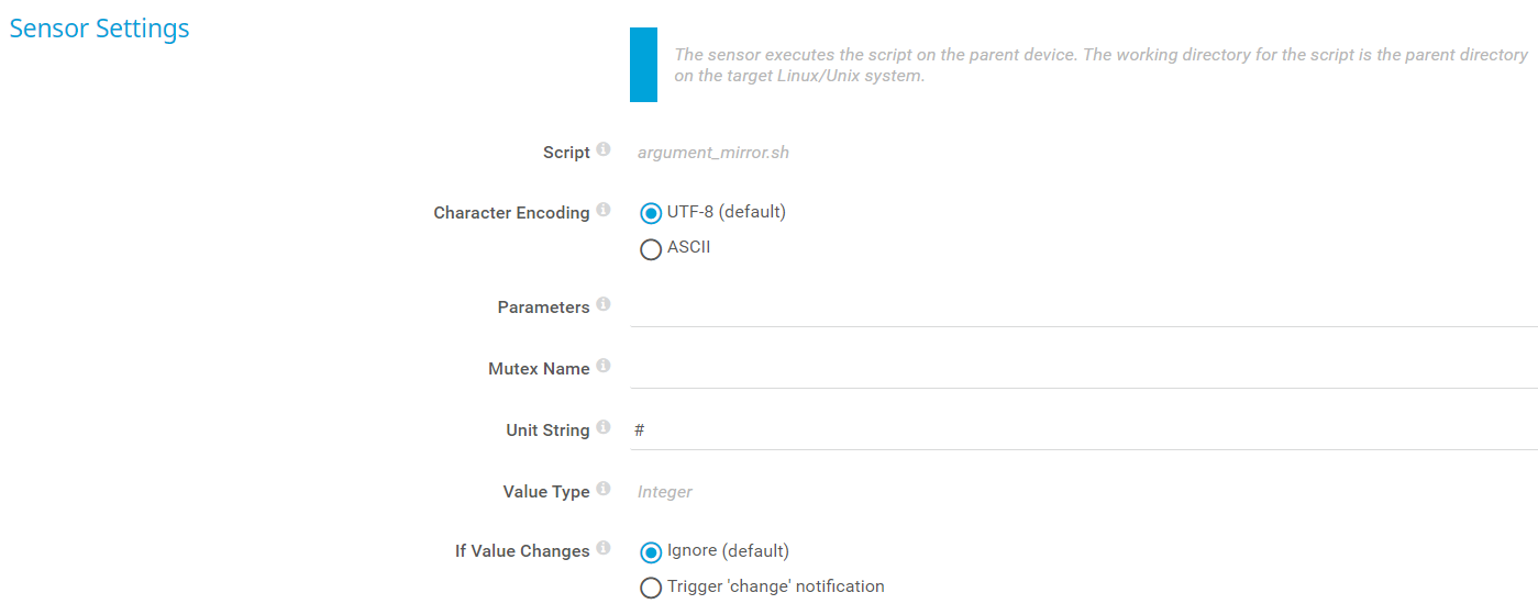 Select a script file from the dropdown list. It shows all script files that are available in the /var/prtg/scripts directory on the target Linux/Unix system. For a script file to appear in this list, store the target file in this directory.