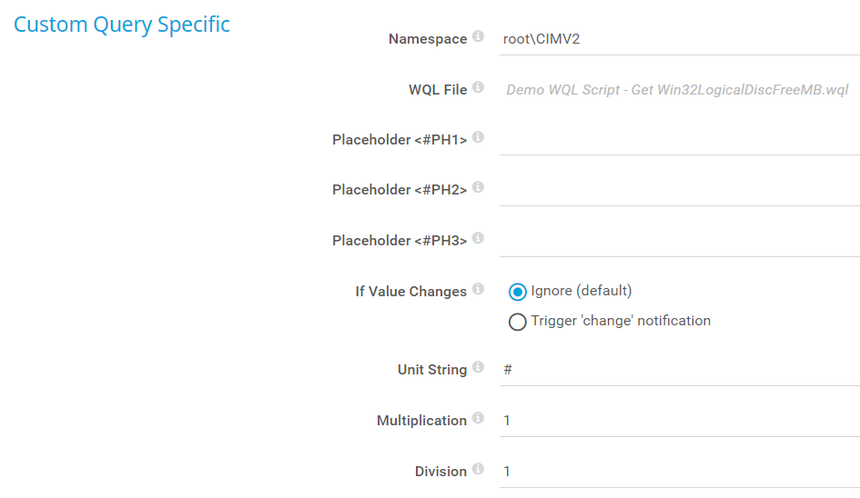 In your WQL script, you can use up to three placeholders to which you can assign a value in this field. Enter a string for variable <#PH1> or leave the field empty.
